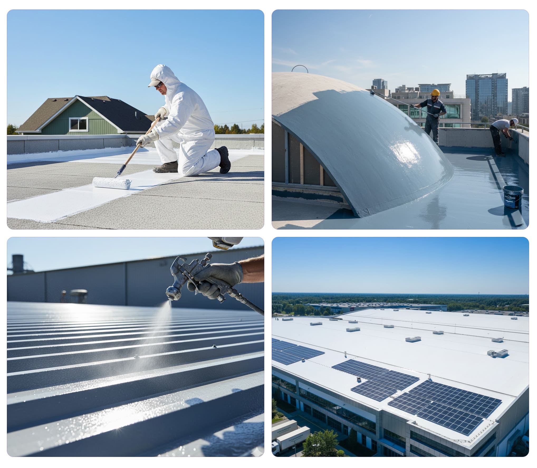 Metal sheet roofs, concrete roofs, and tiled roofs where crack bridging and UV protection are essential.